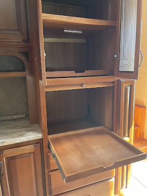 This is a beautiful 5th wheel inside and out. The wood inside glows, all systems are working, it tows smoothly. All regular maintenance and many upgrades have been completed over the years. (More on this later.) And unlike many DRV models, you can access the bathroom and bedroom while traveling without opening the slide outs. This is a huge plus and one of the many factors in choosing this model.
